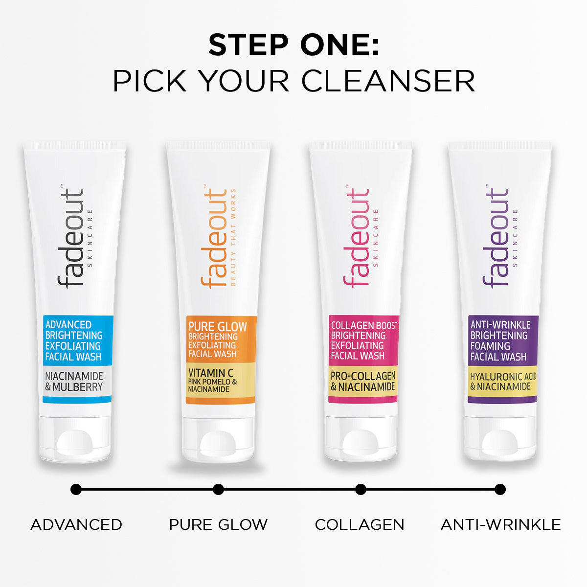Pure Glow Brightening Facial Wash: Aqua, Stearic Acid, Glycerin, Myristic Acid, Potassium Hydroxide, PEG-100 Stearate, Glyceryl Stearate, Hydrated Silica, Phenoxyethanol, Parfum, Niacinamide, Sodium Ascorbyl, Phosphate, Citrus Paradisi (Grapefruit) Fruit Extract, Citric Acid.