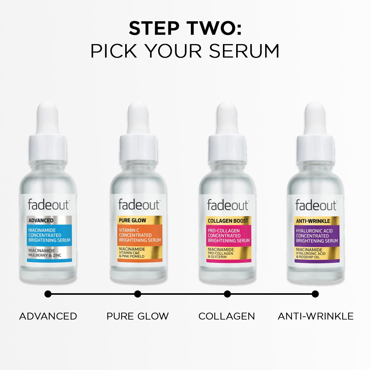 Advanced Concentrated Brightening Serum: Aqua, Propylene Glycol, Glycerin, Niacinamide, Zinc PCA, Hibiscus Sabdariffa Flower Extract, Morus Alba Bark Extract, Cucumis Sativus Seed Extract, Phenoxyethanol, Ethylhexylglycerin, Xanthan Gum, Sodium Benzoate, Potassium Sorbate.